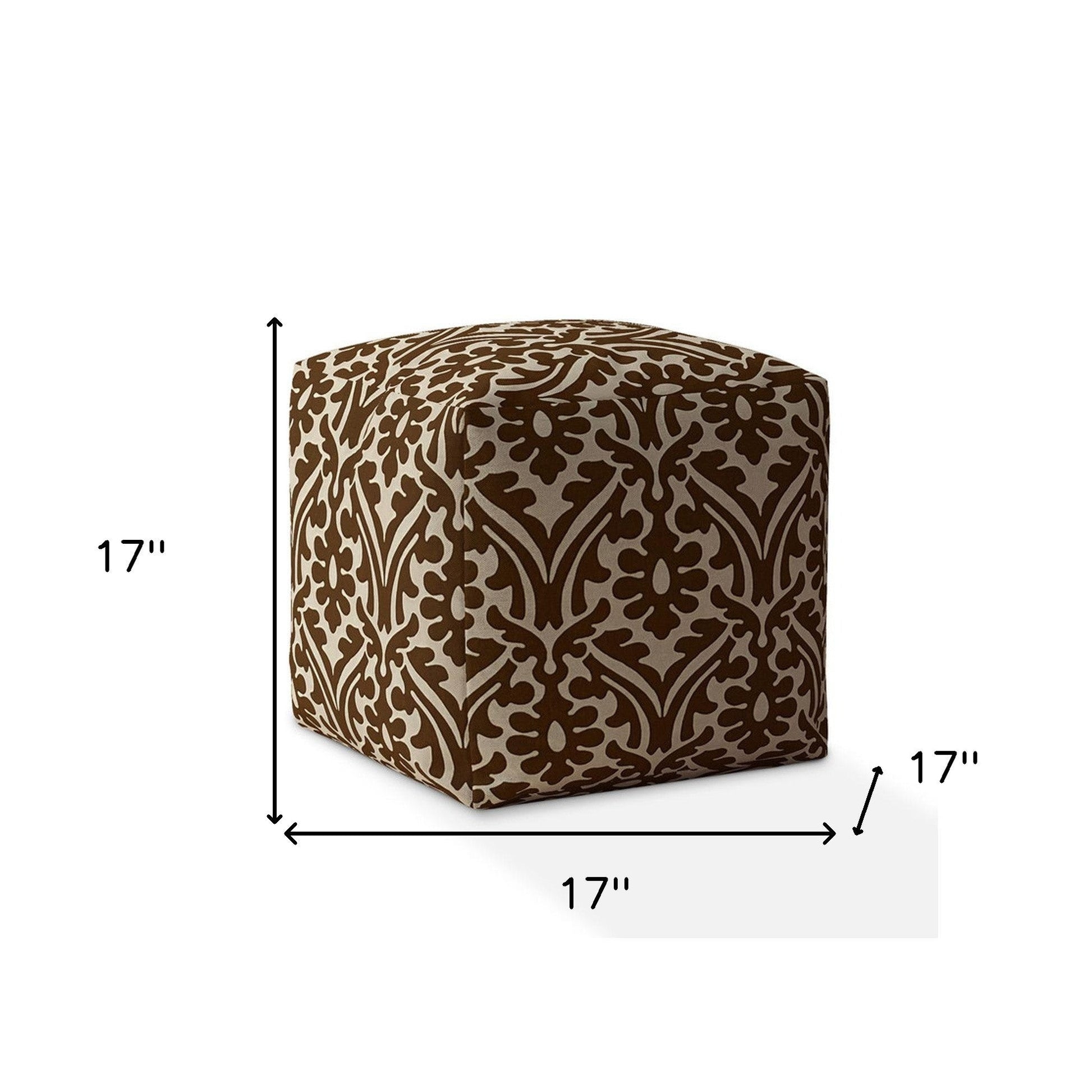 Get ready to relax with this 17" brown cotton damask pouf cover. Expertly upholstered with padding and soft cotton in a damask pattern, this ottoman is as comfortable as it is good looking. Easy to blend into most any room, a ottoman is a way to add a good looking accent to your space that can also be practical and useful. . 17" H x 17" W x 1" D