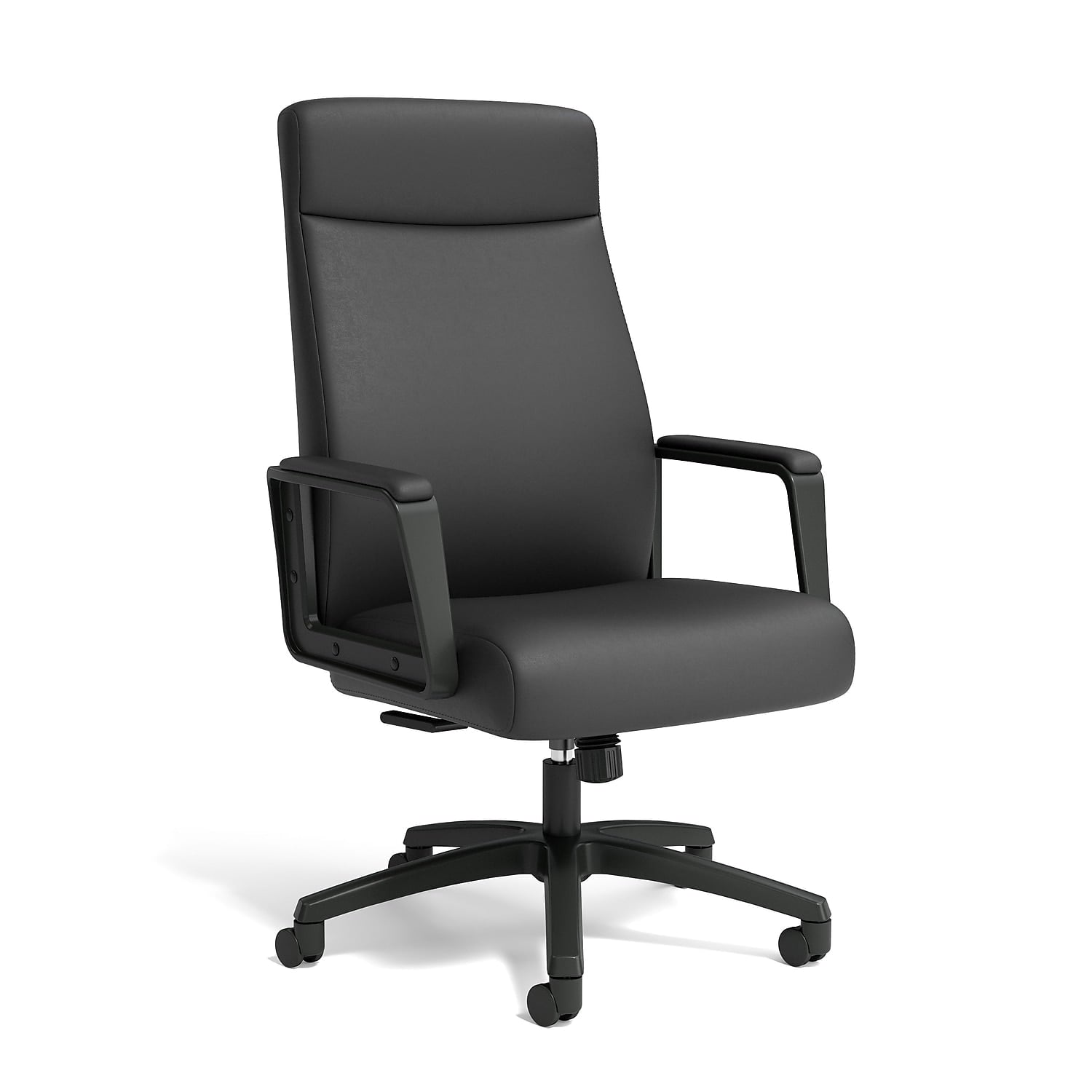 Complete your comfortable office setup with this Prestige manager chair.Outfit your workstation with this manager chair. The backrest and armrests offer support, while the contoured padded seat provides all-day comfort. An integrated tension knob gives you control over the reclining resistance, and the five-star base adds stability for long-lasting use. A pneumatic handle easily adjusts the height, customizing the seat to your body for good posture, while the bonded leather upholstery brings a professional air to your workspace. The 360-degree casters roll smoothly, letting you move around easily while multitasking. Featuring a tilt lock, this Prestige manager chair lets you sit in an upright position during meetings, and the ANSI/BIFMA-compliant construction supports workplace safety and stability, creating a lasting seating solution. Prestige, a collection by Union & Scale. Manager chair with adjustable seat height. Comes in black and made of bonded leather. Overall dimensions: 42.01-45.87'H x 28.3'W x 29.4'D. Seat dimension: 16.69-20.67'H x 20.87'W x 17.76'D. Back dimensions: 20.79'W x 28.86'D. Fixed arms provide added comfort. Tilt tension knob allows you to adjust the resistance of the chair for reclining, while upright tilt lock can lock the chair in an upright position or unlock it to allow you to recline back. Rated for up to 275 lbs. based on an 8-hour workday. Assembly required. Meets or exceeds ANSI/BIFMA standards. 7-year manufacturer limited warranty. Sold as 1 Each.