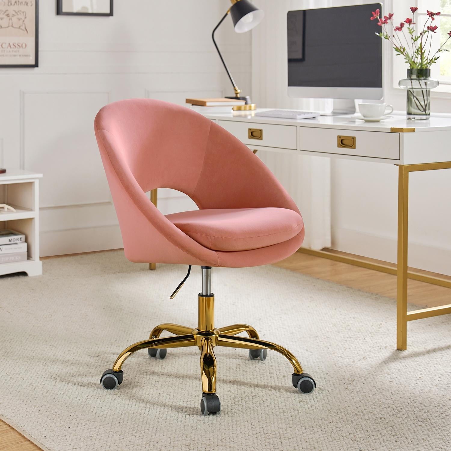 Velvet Swivel Rolling Home Office Chair Height Adjustable Computer Task Chair Metal Base Bedroom Pink