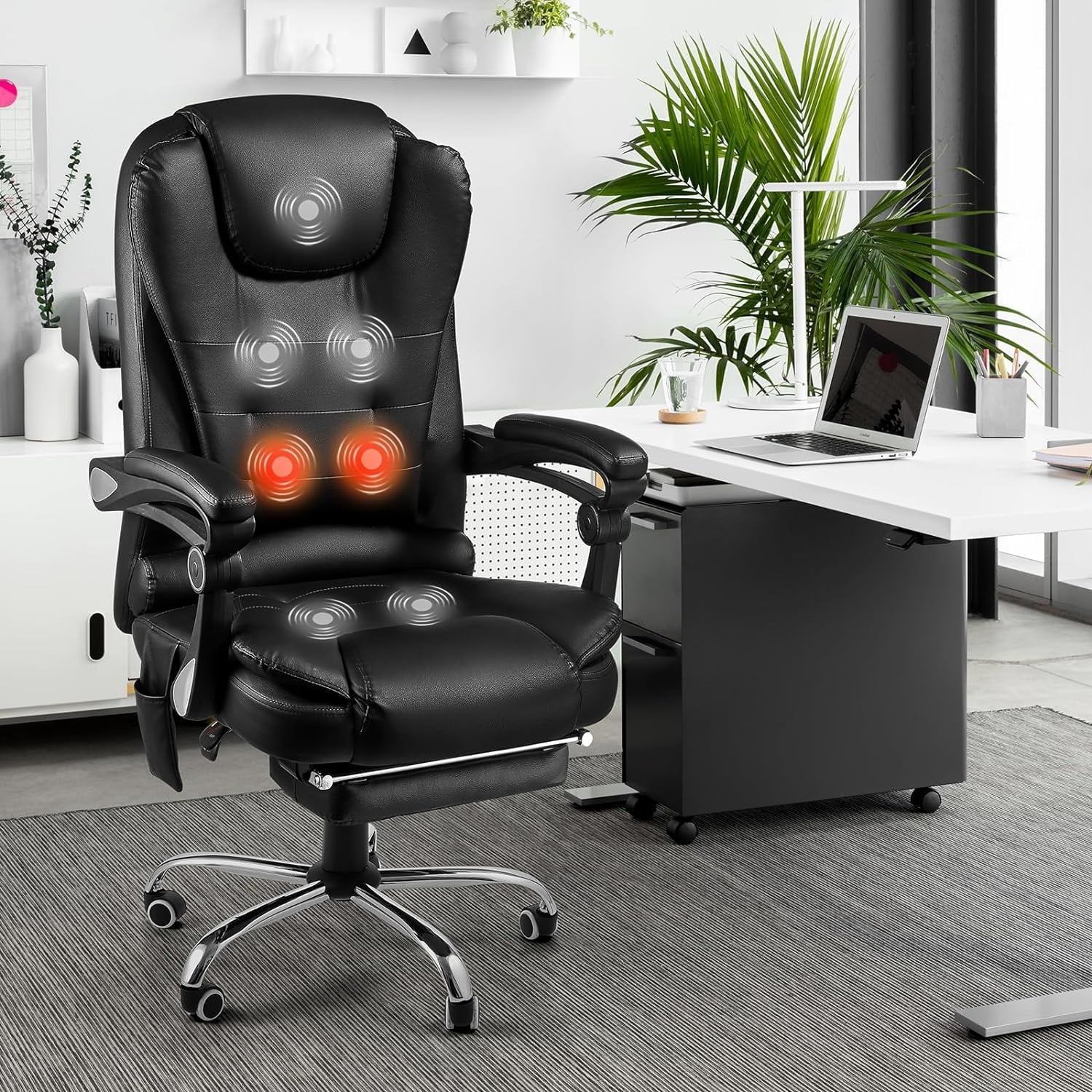 YODOLLA Ergonomic Reclining Office Chair, Heat & Massage High Back Desk Chair w/Retractable Footrest, Executive Swivel Leather Chair for Office, Home, Study, Black